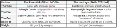 We offer The Essential (Gildan 64000) for those who love a soft, lightweight feel, and The Heritage (Stella STTU169) for those who prefer a premium, heavyweight drape. Check the comparison table below to find your perfect match.